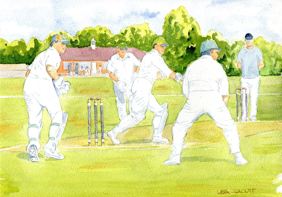 This fantastic watercolour by village artist Les Colcutt is on the August page of the Fernhurst Centre's 2020 calendar. He used several photos by Simon Vigar to create this composite. The main action is from the 2018 game against Tilford and shows opening batsman Mark Charman about to run after a cut shot. Partner Mike Allen is setting off at the other end.